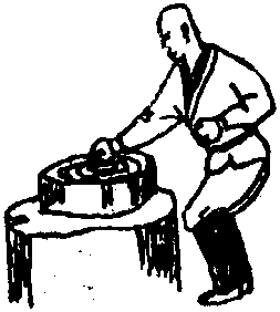 在木墩上主要是练拳的下砸劲其法是以马步势站立