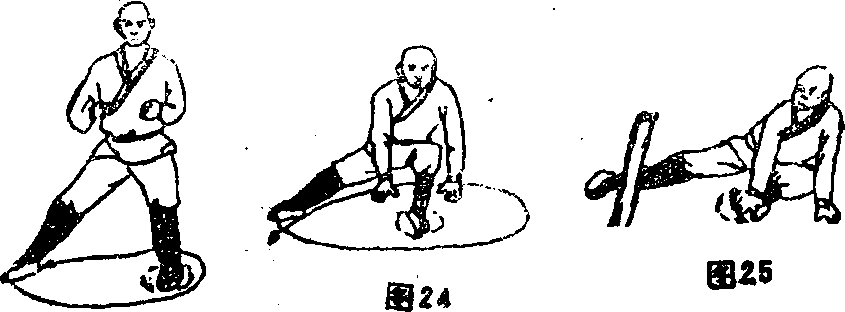 溜地扫周(360度)亦祢前扫腿。依此法每日练百余次、五月后两手离地仍抬右腿苦练扫趟,每天150次,缭芝兰个月,可改练腿趟木桩(图25)。