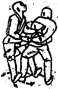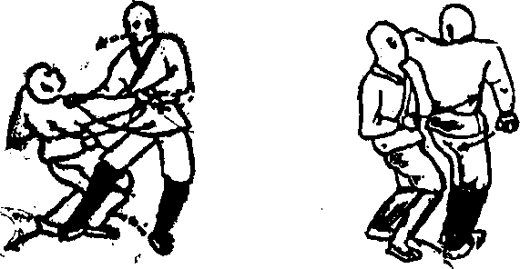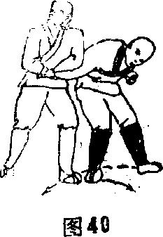 转90度抬右脚上步落于乙右脚内侧,屈膝变成马步左手收回抓抱乙右腿外后侧右手收回插入乙裆内上托抓抱乙右后胯部目视前下方3乙双手抱住甲后腰抱紧不放双方相持不让,乙目视甲后背(图42)