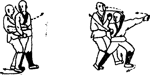乙双手抱住甲后腰不放甲右足离地向后移步落于乙两足之间左拳收回,与右拳同时下落于两胯前侧拳心向内拳眼向前,甲乙互视(图37)