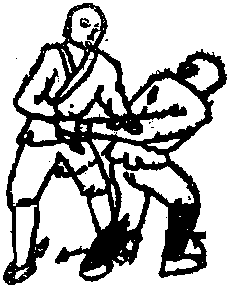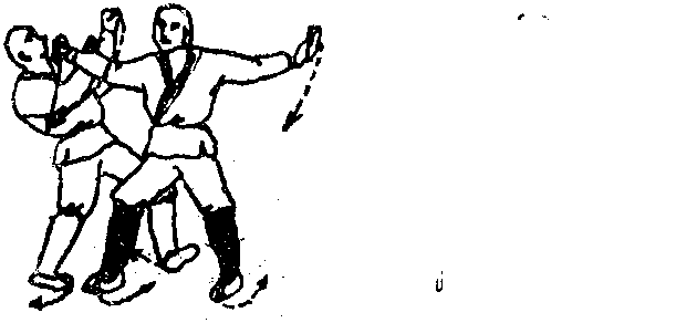 甲抬右脚向右削侧迈半步落地,再抬专脚向后退一步落地后两腿屈膝参向左转,左拳收于而下,拳心向前,目视乙头面乙两脚不动右手抓甲右手腕左掌按击甲肘关节目视我右肩和头部(图120)上动不停甲两脚碾地,体左转90度两腿变成马步,左拳变掌向乙裆部托击八目