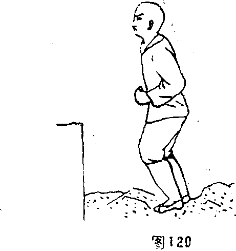 跳砂坑是练纵身向上的基本功。方法是在地上挖个深三尺五寸的砂坑在坑内垫石砂一尺厚使坑底砂面距地面约二尺半左右6练功者腿上缠附铁瓦或砂袋下坑。起跳前先做腿膝活动三至五分钟然后面向南挺身站立运气三循。右脚向前上半步吸气收腹使气聚丹田两手握拳抱于腰间(图120)先抬左脚后起右脚发气纵步上跳跳出坑后前脚掌先着地。在全身腾空跃上地面时两拳变掌并由身体两侧向前平展。目视前方(图121)稍停片刻两脚同时离开地面向后倒跳下坑。每天早晨、上午和下午(饭后两小时)练跳15—20次。如不能顺利跳出可在坑底再垫石砂半尺。如能顺利跳出可逐步加深砂坑当顺利跳到四尺至四尺半甚至五尺时去掉两腿上砂袋或铢