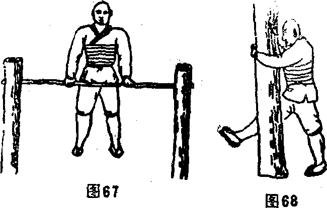 6 放卜铁杠子在木杠上边盘、抱、搂打击、踢碰等(图68)