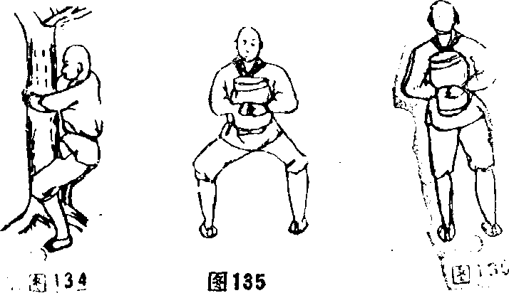 1 初练此功时可选择一棵合抱之树身立树下两腿微屈膝蹲身用两臂紧紧抱住树身(图134)两手十指相扣在一起用力抱持时时作上提之势。每天抱数次每次以力量用尽为止。如此经过二年功夫两臂、腰、腿之力则大大增加抱持时只须略一摇震树身即摇摇欲折枝叶被震落已初见成效。待能连树拔起之后再练石鼓或石轴由轻至重}依法练习。石头光滑难以抱持最易脱手