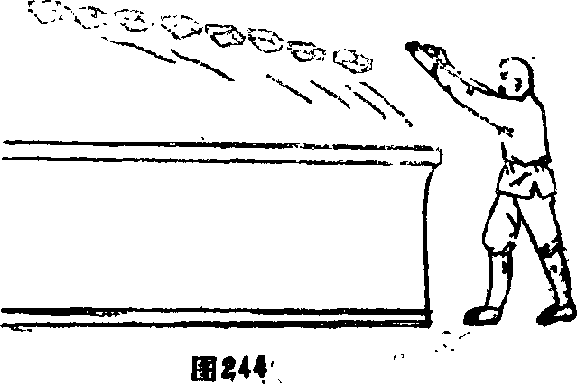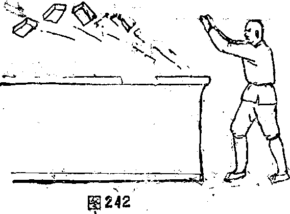 13 直练至双手上提用劲发力弹出青石五块重达240斤,跃至数氏出丈远开外(图241)仍继续锻练积极用功进房
