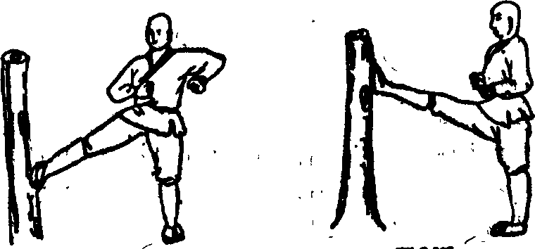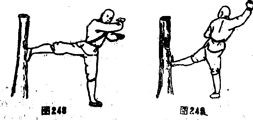 3 练功者可以用脚后跟蹬踢向木桩蹬击仍然左右脚互相交替轮换蹬踢每天早、午、晚分三次练习或者加子时共分四次踢桩每次踢击30腿、50腿100腿渐渐加至一次200腿300腿至500腿每天可踢击1000腿至200°腿。不觉劳累(图248)。