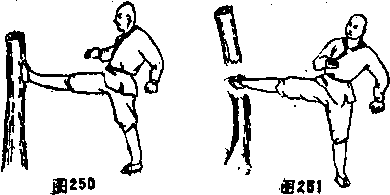 击气如面向迷桩弹踢两脚互相交替轮换弹踢心意中恒木桩为敌卞部各要害部位(图250)。半年以后两腿初瀚力一年以后下部功夫已非平常之人所及并且丽击时气随力注乏故,使下部勇力稳固用足气力站定,三四人摧尤也不能移动。