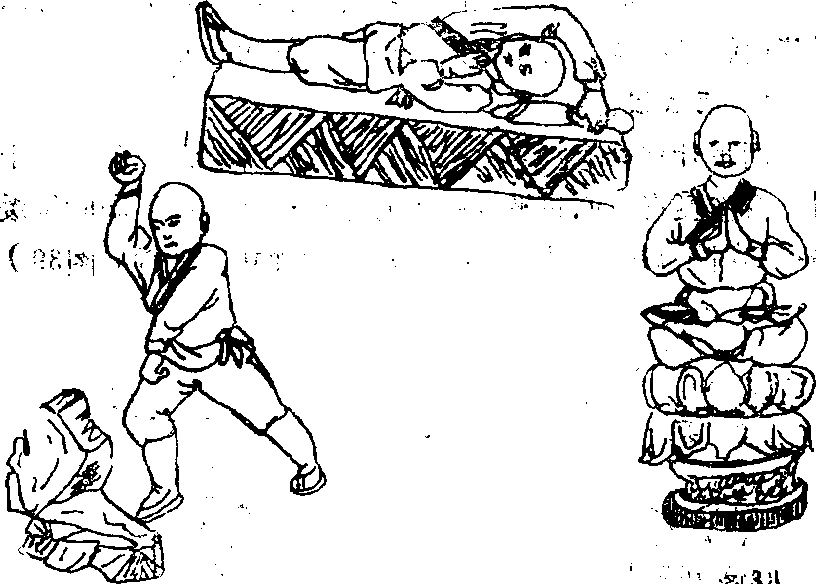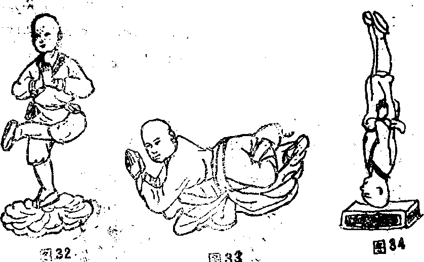 两脚站在一个佛垫或禅盆上一腿立直另一鹿屈麻恳盘然后两臂向内屈肘两手在胸前合掌。完成动作后头向前点立腿微蹲目视两手(图32)