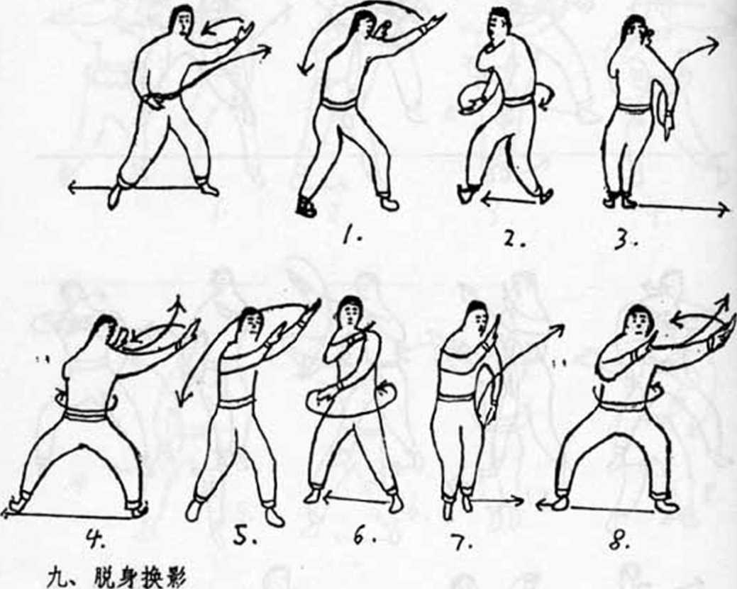 脱身换影是由进步托云,彷才亮旬,埃翅斜飞诧塔完成左右式的分解动作共分为八个节拍未完成。详见图解。