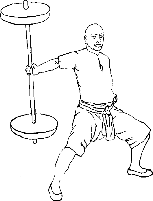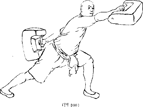 石锁功练法颇多可以举、提可以直臂担起(图100)亦可配合挂槌、抛槌、田槌等法而练也有抛花(即向空中抛起然后出手而接做出种种花样犹如杂要)甚至脚踢者口凡此种种皆为石锁功。