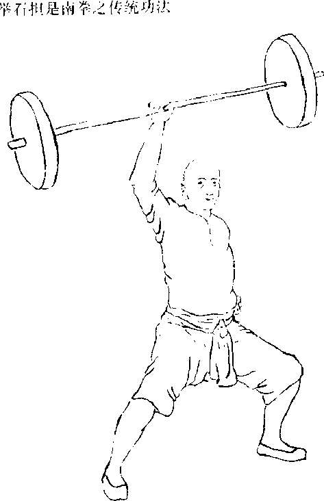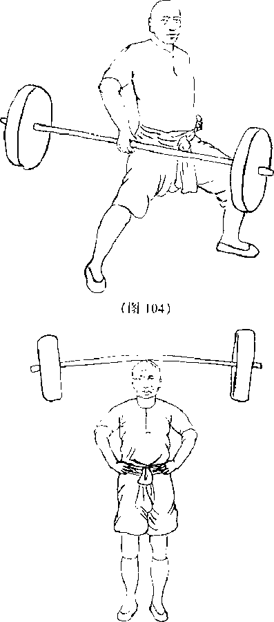 练习此功一股多为上举亦可曲臂提放担口上举之法又分单臂举行双臂举两种此外尚有取四平马两手束腰头顶石担以及用脚挑举石担等练功方法(图103、104,105)(1