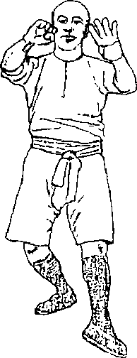 鹤顶手即以凤眼拳势击人之谓,详见虎鹤双形拳中之右鹤顶法(见前图9)一式口