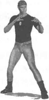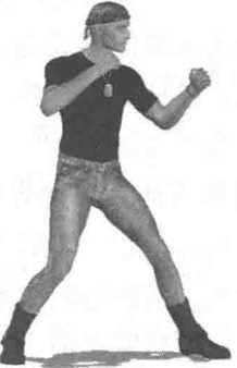 街战桑搏的格斗防御姿势(图16)与拳击手在拳台上摆出的基本战姿(图1-7)类似。这是一种符合人体运动规律从不断地对抗实践中总结并逐步完善最终形成的一种既便于进攻又便于防守反击的格斗站姿。