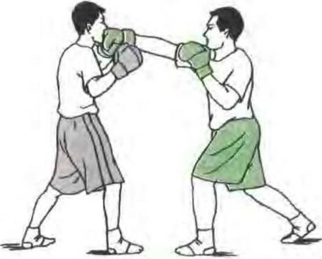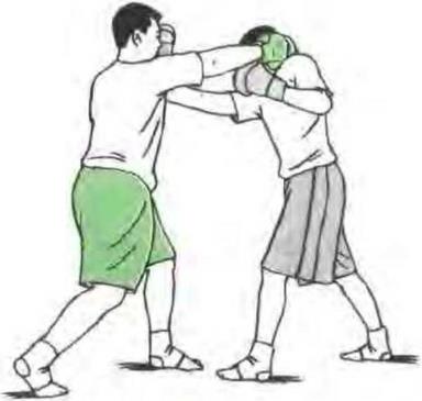 (3)防勾拳双方对峙对方发勾拳攻我腹部我用一手臂向下挡压另一手发直拳攻其面部破解其进攻。(图76)