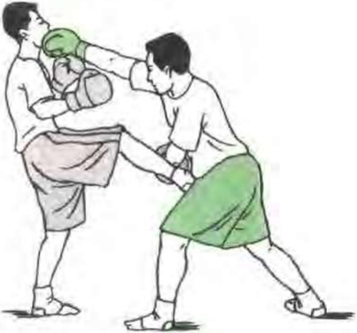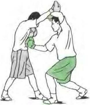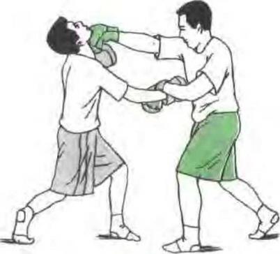 双方对峙对方发摆拳攻我头侧我用一手臂格挡同时发另一手平勾拳攻其头侧部破解其进攻。(图7)