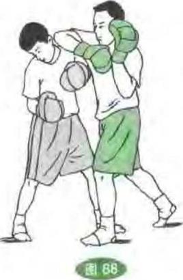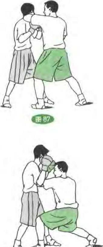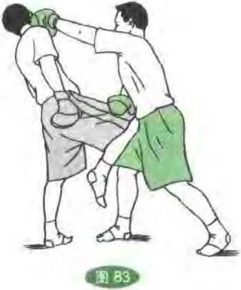 双方对峙对方发旋踢腿攻踢我头部在其转身之机我进身出直拳击攻其后脑破解其进攻。(图82)(9)防冲膝双方对峙对方发冲膝顶我腹部我用一手向下拍挡同时用另一手平钩拳攻其头部或耳侧破解其进攻。(图83)(10)防飞膝双方对峙对方突发飞膝进攻我时我随即向后移步同时发左右直拳攻打其胸腹,破解其进攻。(图84)、(12)防撬肘双方对峙对方发撬肘攻我下颌处我用一手臂横向拔拦,另一手发掴击拳攻打其面门或耳部破解其进攻。(图86)()防剁肘双方对峙对方发剁肘攻我面部时,我用一手臂向上封挡另一手发上钩拳击攻其腹部破解其进攻。(图85)532532532532