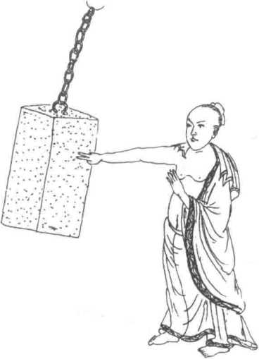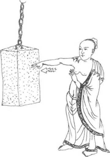 图4-17图4-17练习之法取圆形或方形坚硬的青砂石一个重以100斤为始上凿一孔供拴链之用,四面磨平至光滑。然后吊于一木架上石高与练习者胸高为度。练习时以食、中两指略离于石或微触于石指、腕、臂均屈蓄放松。(图47)