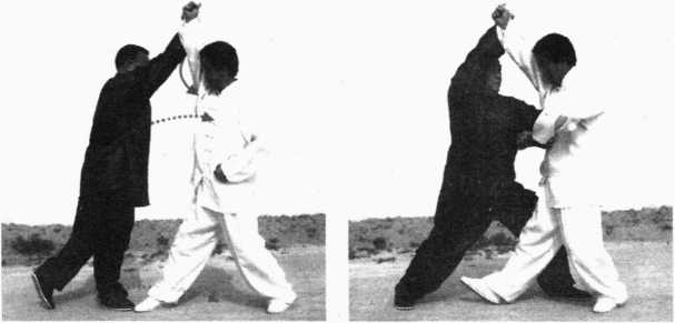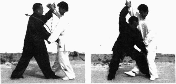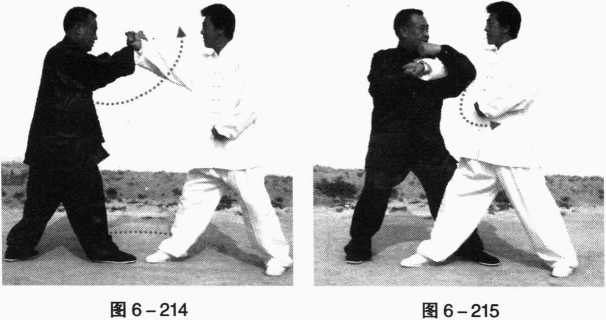 对方左手打来我即双手交叉掌心朝外内旋上抄左掌在里右掌在外上架抄迎左肘向左顶胸右手右领对方左臂,同时右脚横移左脚跟进并步屈膝攻裆(图6-214、图6-215)。