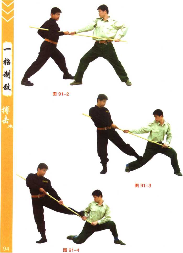 1 敌持棍从左上方向我抡劈打来我右脚蹬地左脚向左前方滑步躲闪避开猛烈攻击疾以右手抓握敌棍中部(图91-1、图91-2)