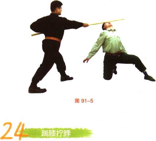2 趁敌跪或坐地之际左手从敌颈后穿过左手抓住敌下颌右侧用髓顶住敌右肘左手向左后方扳拧敌脖制敌(图92-4)。