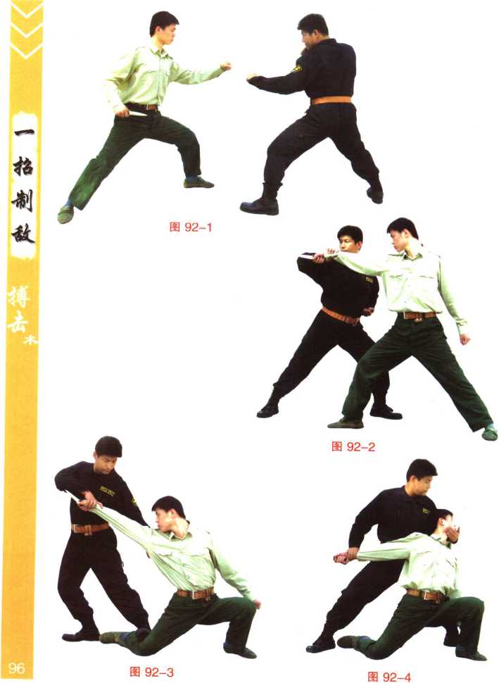 1 敌反握匕首平刺法向我刺来时我迅速左脚上步向右转体躲闪同时右手掳抓敌手腕后拉(图92-1、图92-2),左脚踹敌右膝窝使其跪地或坐地(图92-3)