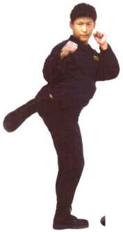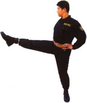 格斗姿势站立如左脚在前进行右脚弹踢时左腿支撑右腿屈膝上提大腿抬平脚面绷直右脚向前水平弹出右脚面与胯同高目视前方(图21-1、图21-2、图21-3)。做到收腹、提膝、脚面绷平、快速弹踢。此腿法主要用于击踢敌裆、腹部。左、右腿交换练习。