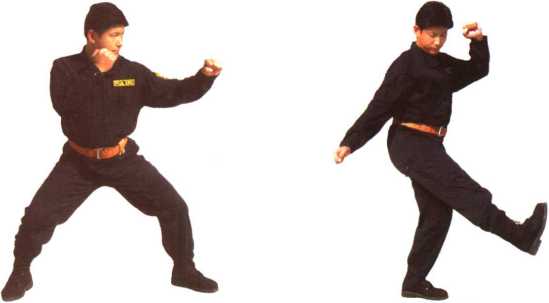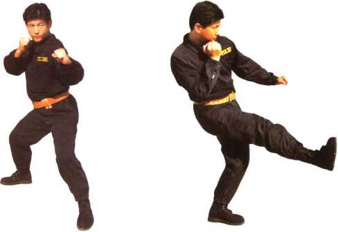 在格斗式基础上左脚向前上半步脚尖略朝外左腿弯曲支撑身体重心右腿屈抬前伸脚尖向外脚弓内侧向前而后向前下方截踢力达脚掌(图22-1、图22-2)。左、右腿交换练习。