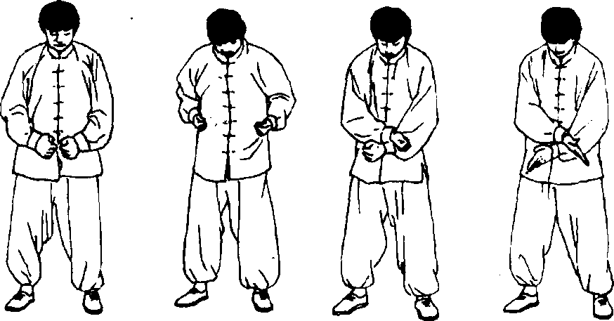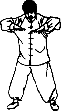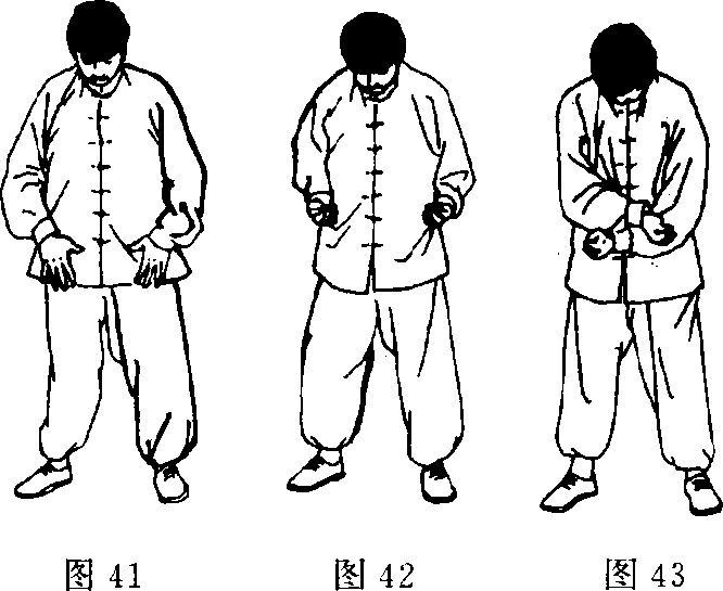 划弧(图41),至腰胯时,两掌开始变拳拳眼朝前拳面向下(图42),绕至肚脐处两拳交叉右拳在上左拳在下稍停一瞬。(图43)