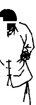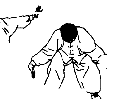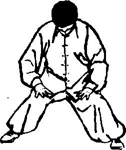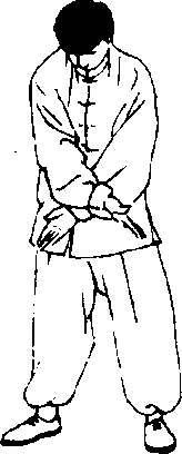 (3)接上动待两臂平直身体前倾,两掌掌指逐渐向下掌心相对两膝弯曲(图50),至两掌近于小腿时两掌内合掌指相对掌心向上呈抱物式(图51)