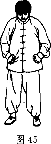 (6)接上式口发嗨声两拳变掌呈交叉式向下猛插腹部同时外鼓。(图44)如此3遍后将拳弧形划至肚脐处(图45),继续行功。