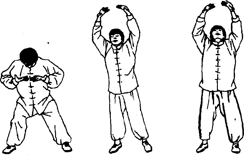 (5)稍停片刻两掌手指自然张开继续贴腹向两侧向上
