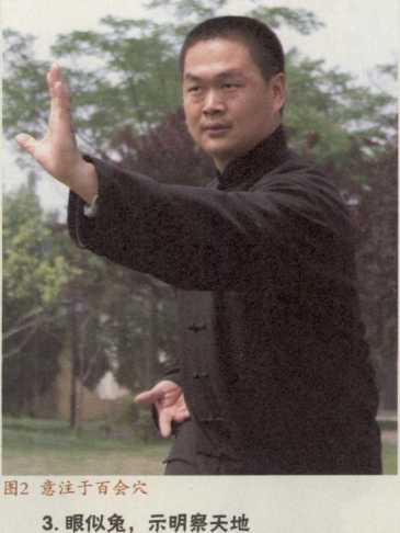 经曰神者心之藏也。心藏神主血脉为君主之官。行功走架吐纳导引时意注于神神乃心之应也。全神贯注使气贯注于头顶百会穴。百会穴乃百脉交会之处有益智开窍、升阳固脱之效。在头顶之正中是人体最高的穴位似角保持平衡的中心点感应于天地气机变化的点。意智专注于百会穴天人合一。使神志清气血畅通于百脉之中(图2)。