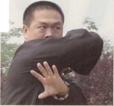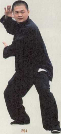 拳谚眼观六路耳听八方。练习六合功时以无极态浑浑然随意自然。六式的转换变化全凭乎耳之应也。中医学认为肾开窍于耳以肾精化气上腾于耳窍充养于耳廓故能闻声知音也。观六合功每一式的推掌之前虎口均要从耳门推过此龙威赫然威镇八荒之真意(图4)。