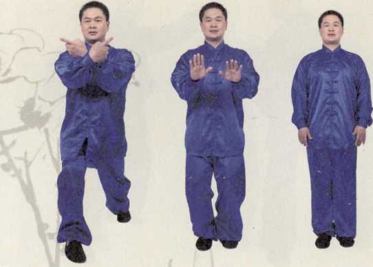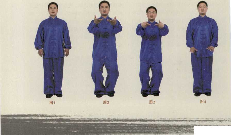 虚领顶劲、沉肩垂肘、尾闾中正、提裆收腹(气沉丹田)舌舐上腭目视正前方自然呼吸——无极式(图1)。吸气双手掌由两腿外侧缓缓抬起同时双膝微屈(图2),双手抬至胸前时双手小指向里刁手(图3),呼气双掌下按至小腹丹田处双膝微起(图4)。——此无极生太极式。经曰太极生两仪。(两仪即阴仪与阳仪阴仪生少阳与太阴阳仪生太阳与少阴此两仪生四象。)斯人父天母地莫非太极阴阳之气酝酿而生天地固此理三教归一亦此理。即宇宙之万事万物又何莫非此理况拳之一艺焉。