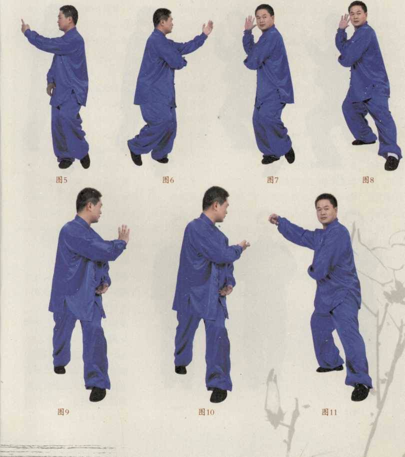 接上式(图4),吸气身体重心由左腿向右移动左脚丁步式重心在右腿上同时左手臂斜行捧起至眉前(图5)。左手随身法向左后转右手置于左肘下重心在左腿上(图6)。眼随手走右手从左肘下云手而过随身法转至右侧重心在右腿这时左肩与右胯相合左肘与右膝相合左手与右脚相合。身法呈裹包状呈一螺旋体(图7)。呼气向前迈左步(图8),右手野马掌从脑后过耳门推出左手瓦棱掌置于腹部与脐平(图9)。此时的右脚尖自转带动身法旋腰公转劲至右掌向左肩位抱抓吸气并右手在左肩位划一圆(图10),同时左手随身法旋转极力向后转。呼气身法重心随即后转移至右腿上右手随身法旋转遂置于身法右侧左手在右肘下目视正前方(图11)。