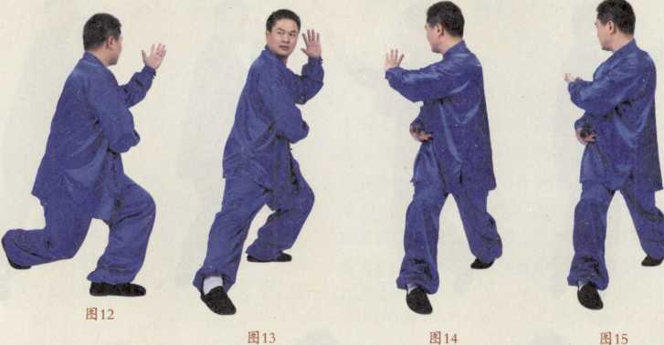 接上式(图11),吸气左脚掌抬起以左脚后跟为旋转点带身法向左旋转时同时身法下沉重心在左腿左手从右肘下抄过右手紧随之(图12)。呼气上右步(图13),身体重心由左腿渐移至右腿随即左手野马掌从脑后耳门向前推出(图14),吸气左手野马掌向右肩部抱抓在右肩部划一圆右手随之后转目视左掌(图15),左手划圆后呼气。如此左右旋转可反复练习一般以八遍为佳。怀中抱月即手法在胸前划一立体太极圆意念抱月之阴阳缠丝手。