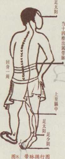 腰转时做到腹中空腹空后以意领气方能气沉丹田。腰的转动是一身之关键腰胯相合力达八面劲放四梢。是腰亦是胯以腰带点百会中极上下一体六劲贯通形成一个立体的空心圆。通过腰的转动可刺激带脉(图8),以加强经脉之间的联系。经曰腰为肾之府转摇不能肾将惫也。现代人的腰痛、腰椎间盘突出症等实际是命门火衰肾虚之故。肾有两枚左右各一左为肾阴右为肾阳。