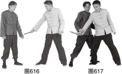 甲与乙对峙时乙用右手反握匕首向正前上右脚由其腹前向甲腹或裆部刺出(图616),甲看准乙攻刺方向迅速向左侧前上左脚成左闪身避开乙攻刺