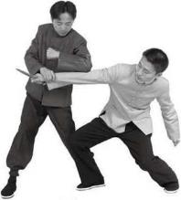 图624 图625图624 图625脚由其腹前向甲腹或裆部刺出(图624),甲看准乙攻势疾向前上右脚左臂下伸由里向外隔挡乙右小臂迫使乙改变刺