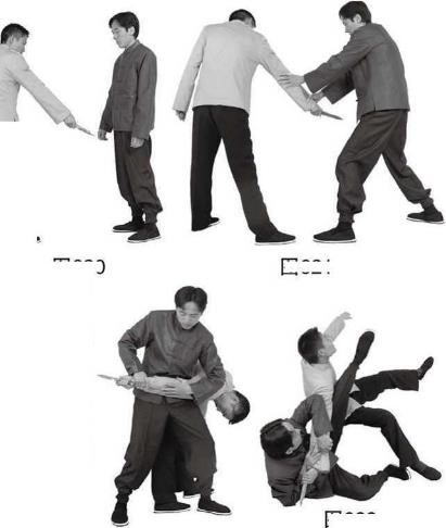 44右臂(图621),紧接着接近乙将乙右腕臂抱在胸前擒住(图622),乙右臂(图621),紧接着接近乙将乙右腕臂抱在胸前擒住(图622),乙图623图623图622图622抱臂拉摔迅抱臂拉摔迅图620图620图621图621被迫俯身欲抽脱被抱手臂甲动作不停猛抱住乙右手臂向右侧拉将乙拉摔跌倒瞬间甲侧跌于地起左腿向后扫踢乙颈部(图623)石说明被迫俯身欲抽脱被抱手臂甲动作不停猛抱住乙右手臂向右侧拉将乙拉摔跌倒瞬间甲侧跌于地起左腿向后扫踢乙颈部(图623)石说明判断凶器刺的方向和时机挡臂及时,猛扫踢颈突然。作用用于夺取反握匕首下刺腹或裆部。判断凶器刺的方向和时机挡臂及时,猛扫踢颈突然。作用用于夺取反握匕首下刺腹或裆部。