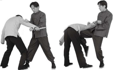 被迫俯身欲抽脱被抱手臂甲动作不停猛抱住乙右手臂向右侧拉将乙拉摔跌倒瞬间甲侧跌于地起左腿向后扫踢乙颈部(图623)石说明