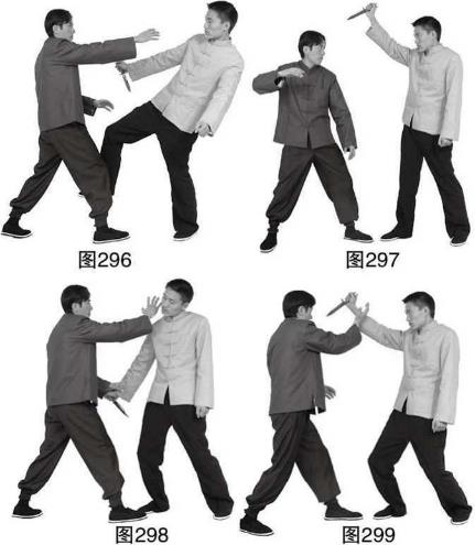甲与乙对峙时乙右手正握匕首由上而下刺杀甲头面部(图296),甲迅速左转身右掌朝左向内前下横向击出用右掌击砍乙右腕关节内侧以挡住乙的刺杀(图297),
