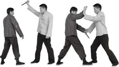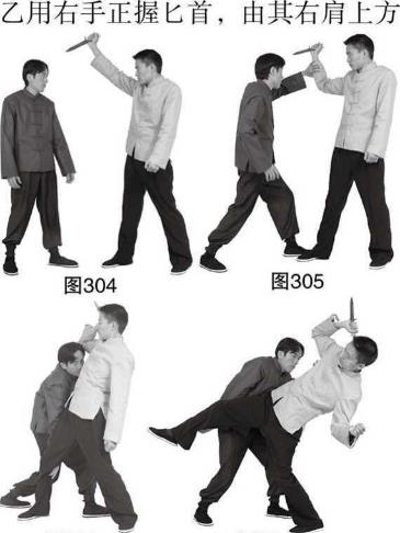 时乙右手正握匕首由上而下刺击甲头面部(图300),甲迅速稍左闪身避开乙