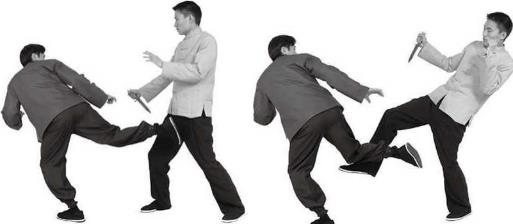 图300 图301图300 图301攻势紧跟上步接近乙用左掌向内拍拨开乙的右臂并向前推出右手上抬挥打乙面门(图301),在乙被迫防守失措瞬间甲左转身倾身前屈同时提右腿脚向后猛撩踢乙裆部(图302),迫使乙被击后退(图303)。