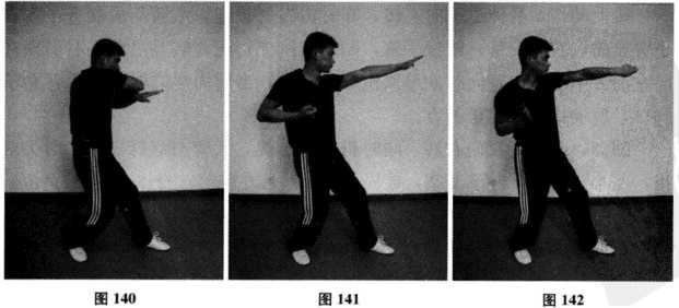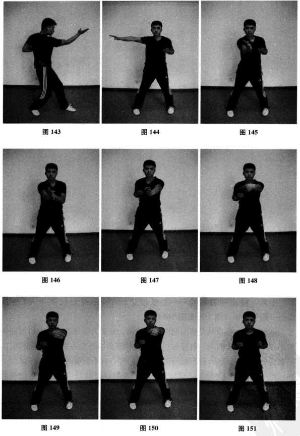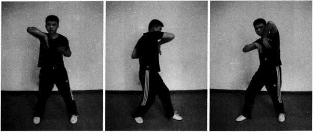 随即身体继续向右转同时将左肘上提大臂与肩膀齐平肘尖前指左小臂屈曲左拳变掌放松手腕贴近左胸侧身体迅速向右转马随右转马之势左肘横向向右前方中线击出力尽之时将左手背贴于胸口肘尖指向身体正前方此之谓横劈肘左右击肘之法。