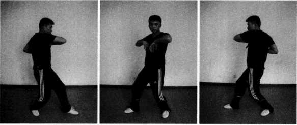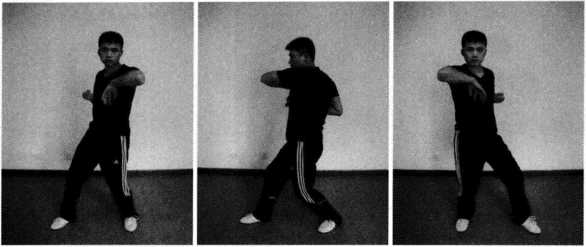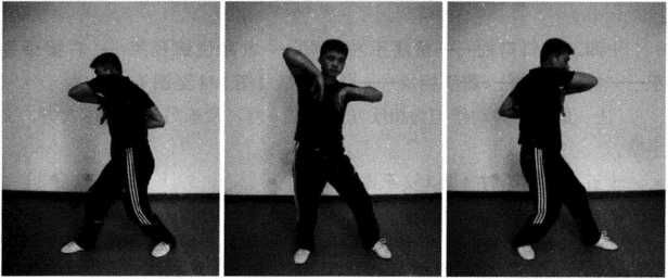 依循上式将左肘上提大臂与肩膀齐平肘尖前指左小臂屈曲左拳变掌放松手腕贴近左胸侧身体迅速向右转马随右转马之势,左肘横向向右前方中线击出力尽之时将左手背贴于胸口肘尖指向身体正前方。