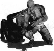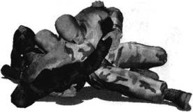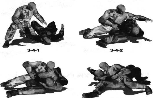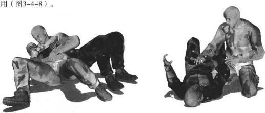 2、 这是一种比较特殊的变通用法双方交手时对手被动仰摔在地我由对手右侧突入对手挣扎欲坐起身我用左手揽住对方右臂右手按压其右肩头(图3-4-6)随即在对方挣扎过程中右臂顺势屈肘由对手脖颈后侧绕过再穿过其左侧腋窝用右手抓紧对方后肩身体重心向右侧倾倒以右侧臀部着地左腿向后摆动右腿向前伸展前后岔开的双腿与臀部在地面上呈一个人字形(图3-4-7)。这种袈裟固的变通应用的特点不是用胸部去压制对方而是用后背、肩胛部位压制对方的头及后颈部迫使对方受制于我而无法挣脱。