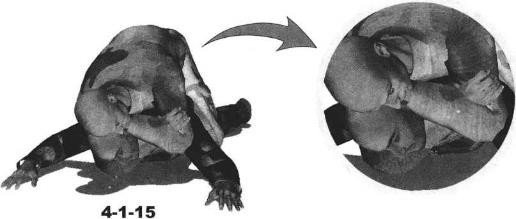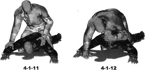 地面缠斗中对手面朝下趴伏于地面我骑乘于对手后背之上双腿夹紧对方躯干双手按压其双肩令其处于被动局面(图4-1-11)展开攻击时我先向前俯身用右手扶撑对手头部右前方地面并用左手自下而上搬拉对方额头迫使其向上抬起头来令其颈部下方露出空隙(图4-1-12)随即右臂屈肘右手自右向左由对方脖颈下方穿插头部左侧以右小臂梅骨横揽住其咽喉部位准备实施扼绞(图