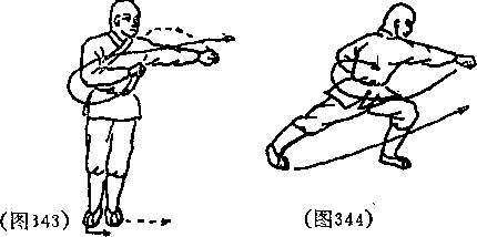 两脚不动两掌变拳在胸前环弧左拳向左冲出拳心向下,右拳屈肘向左抖拳目视左拳(见图343)。