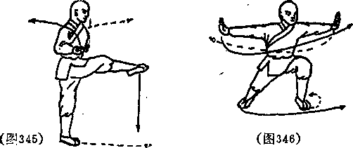 左脚不动右拳变掌向前抓搂然后变拳抱于腰间,同时抬右脚向前弹踢(见图345)。